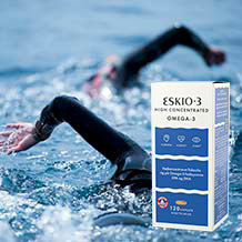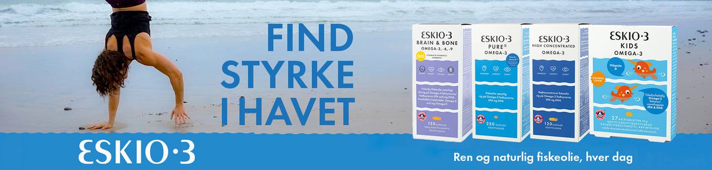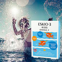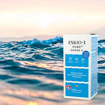 ESKIO-3 er en ren og bæredyktig fiskeolje med naturlig innhold av omega-3. ESKIO-3 inneholder Pufanox® som beskytter og bidrar til en mer holdbar olje over tid. Omega-3 fettsyrer bidrar til en normal funksjon av hjernen, hjertet og synet, og inneholder EPA* og DHA*, som det er spesielt mye av i fettholdig fisk som laks, makrell, ansjos og sardiner, samt i linfrøolje og hampfrøolje.
