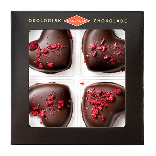 Marcipan rørt med frysetørret hindbærpulver og overtrukket af 70% mørk chokolade. Indeholder 4 stk.