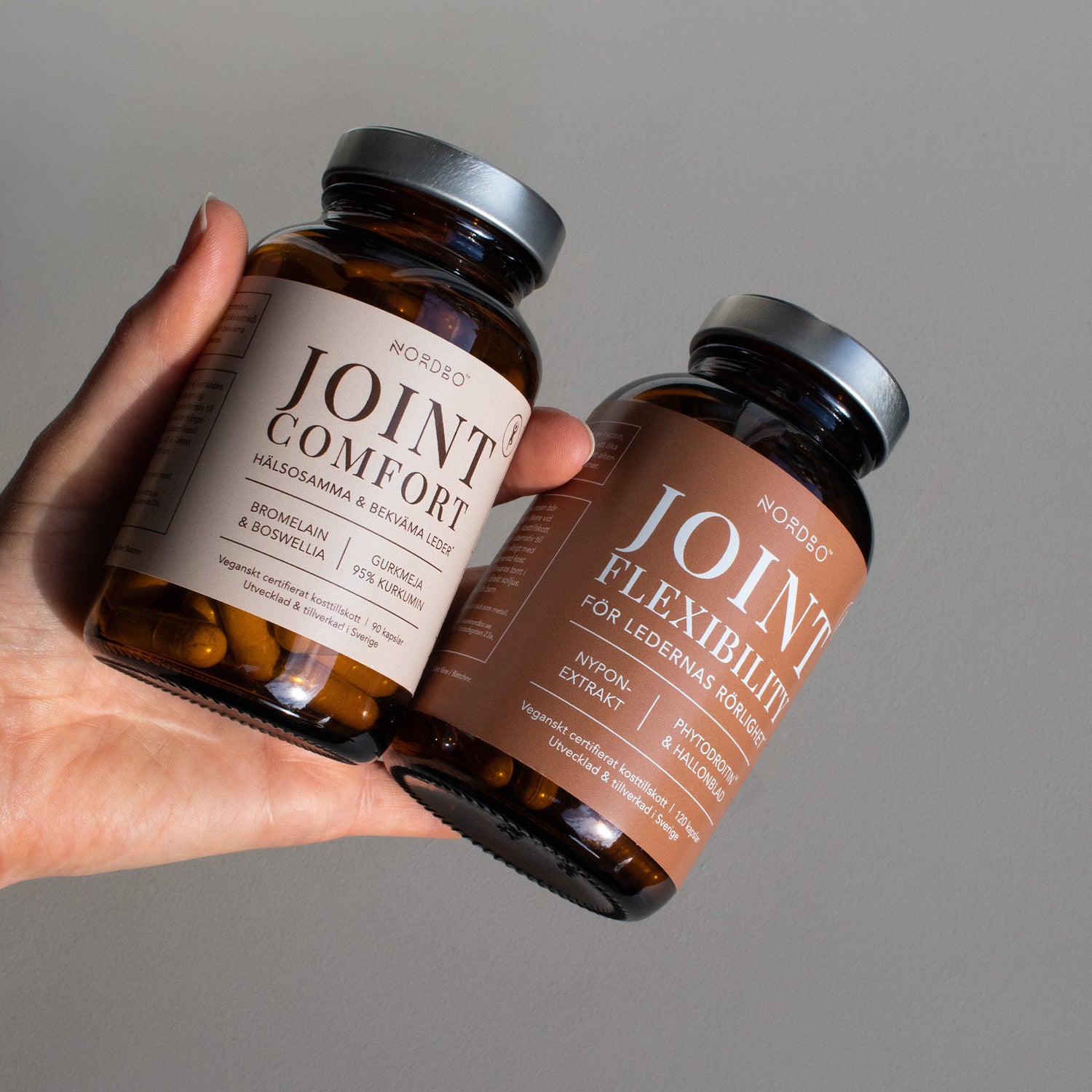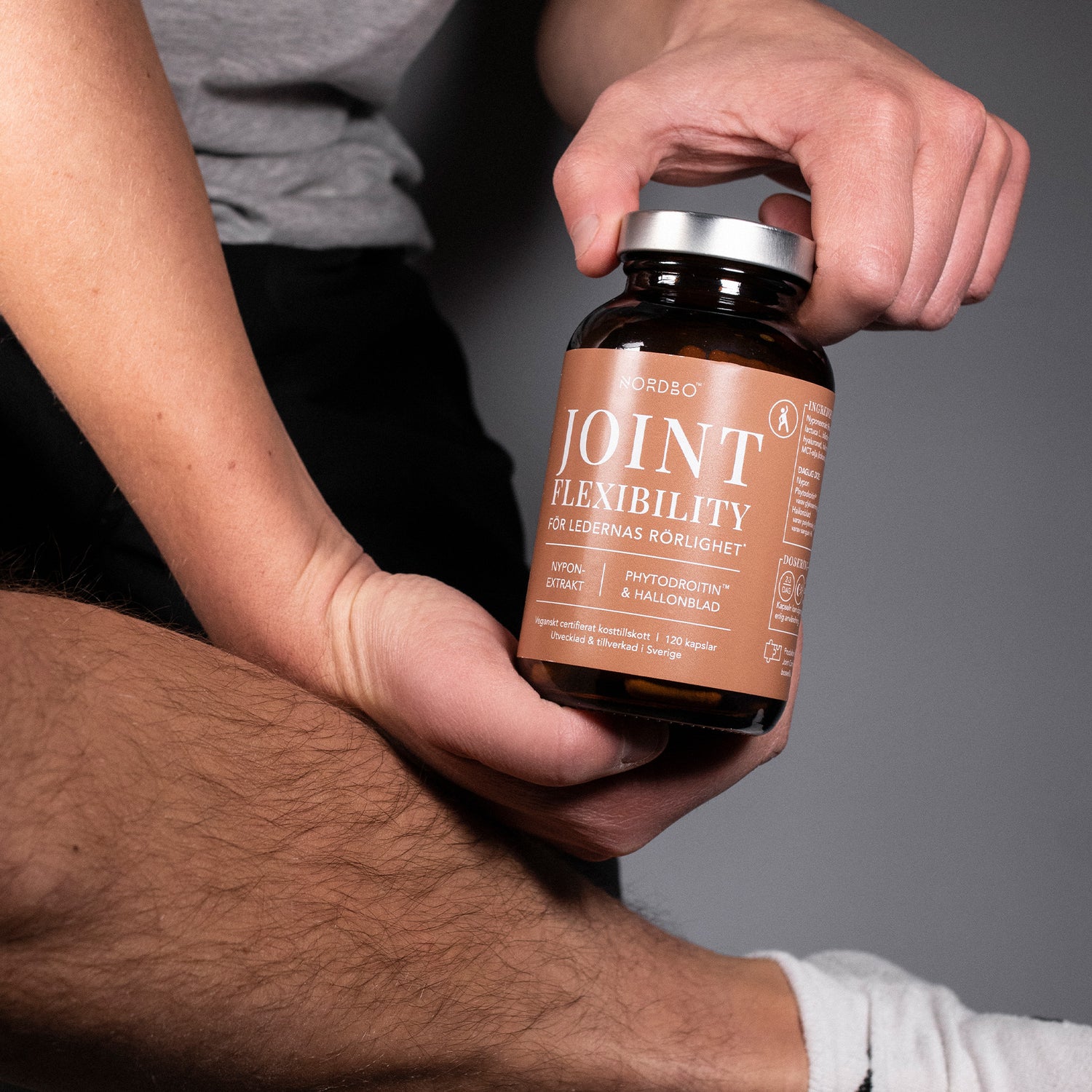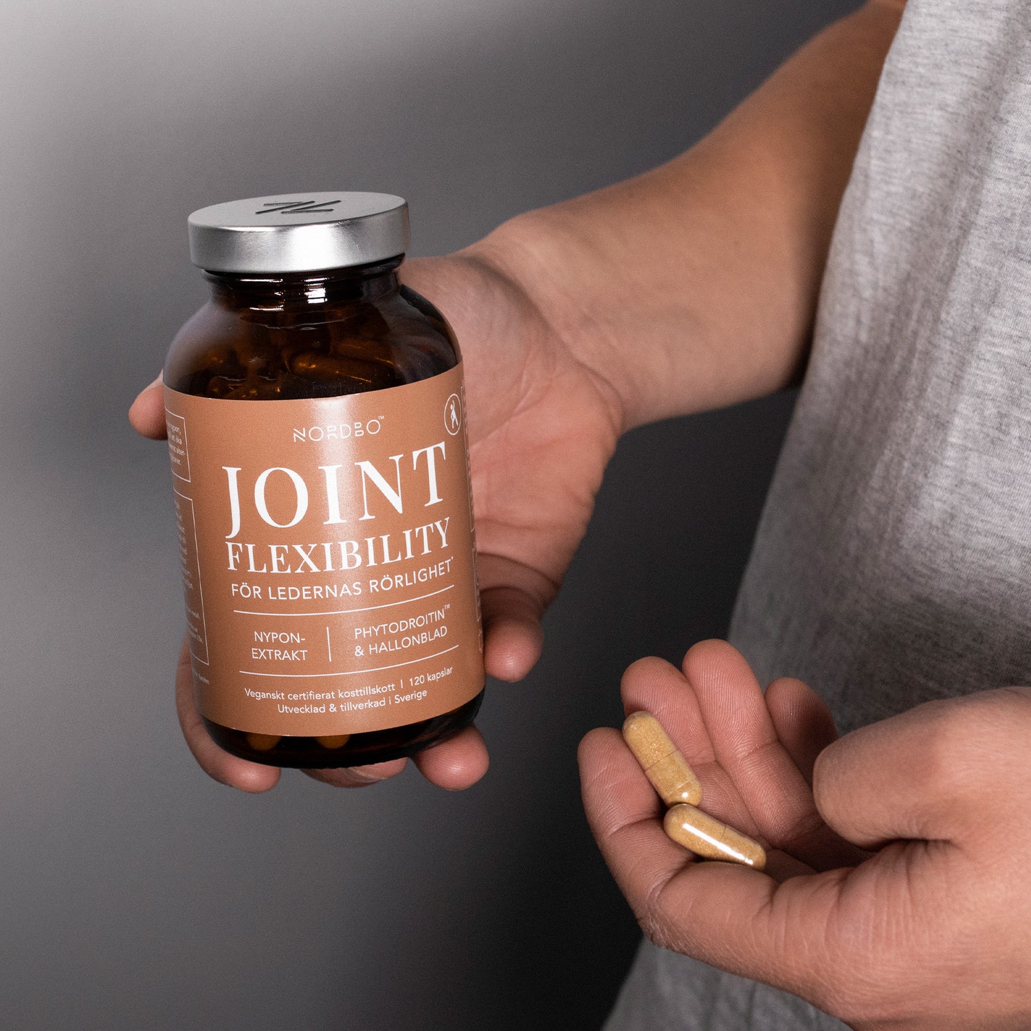 NORDBO Joint Flexibility indeholder et veldokumenteret tredobbelt kompleks af hyben, Phytodroitin™ og hindbærblade. Phytodroitin™ er et ekstrakt af alger, rig på glycosaminoglycaner. Phytodroitin™ er et plantebaseret alternativ til chondroitin. Hindbærblade er rige på polyfenoler (antioxidanter), hovedsageligt gallussyre. Produktet anbefales til daglig indtagelse og kan kombineres med Joint Comfort.? Joint Flexibility er vegansk certificeret.