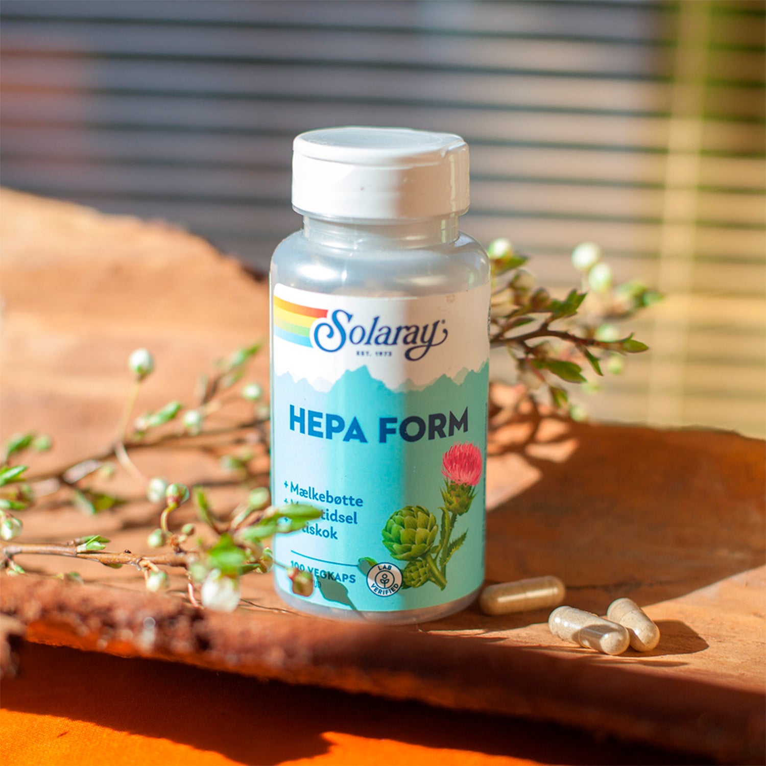 Solaray Hepa Form er et urtebaseret kosttilskud med cholin og udvalgte urter som mælkebøtterod, marietidselfrø, artiskok og pebermynte i vegetabilske kapsler.